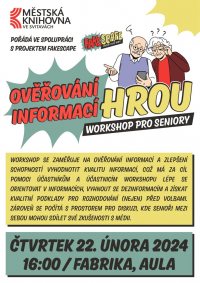 Workshop se zaměřuje se na ověřování informací a zlepšení schopností vyhodnotit kvalitu informací, což má za cíl pomoci účastníkům a účastnicím lépe se orientovat v informacích, vyhnout se dezinformacím a získat kvalitní podklady pro rozhodování (nejen) před volbami. Workshop se skládá ze dvou hlavních částí. První část tvoří herní aktivita, jejímž cílem je zprostředkovat seniorům zkušenost s ověřováním informací a zlepšit jejich schopnost rozpoznat fakta, názory a chybné informace. Ve druhé části následuje debata, ve které se reflektují témata z první herní části, a na příkladech se ukazuje, jak lze znalosti a schopnosti získané v úvodní části uplatnit v každodenní mediální praxi. Zároveň se počítá s prostorem pro diskuzi, kde senioři mezi sebou mohou sdílet své zkušenosti s médii. Pořádáno ve spolupráci s projektem Fakescape.